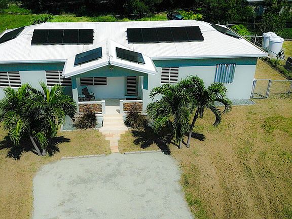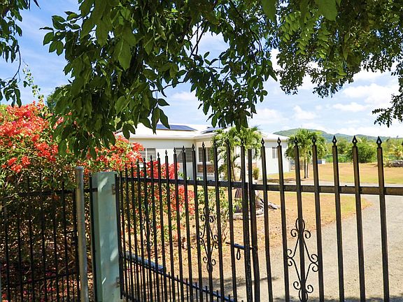 Nestled just outside Frederiksted town, this stunning 3-bedroom, 2-bathroom home offers a serene lifestyle on a private, fully fenced acre. It features extensive updates, including brand-new electrical wiring, a cutting-edge Enphase solar system with battery backup for off grid sustainable living, and modern appliances. The fully air-conditioned interior is complemented by new fans, light fixtures, and many windows that bring natural light into the home.Ideal for those with a green thumb, the property is outfitted with two compost beds, three raised garden beds, and two 600-gallon water buffalos. The 20x9 two-chambered cistern provides ample water storage, supplemented by an old cistern reserved for gardening. Flowering and fruiting plants add to the lush, tropical setting. Pet lovers will appreciate the double fencing that ensures a safe space for furry friends.