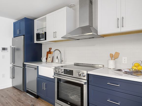Balconies and terracesSpacious lobbyStylish kitchensStainless-steel appliancesWhite and blue cabinetry