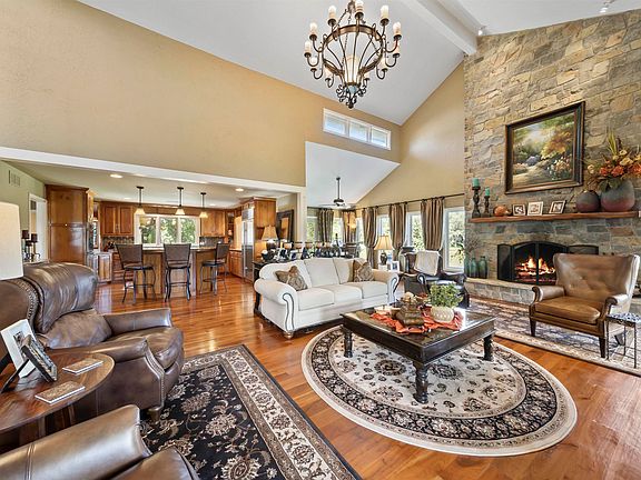 Introducing a One-of-a-kind 1970’s Contemporary Lake Property offering the Ultimate in Privacy! This grand home offers stylish living with unsurpassed entertaining space inside and out paired with panoramic lake views. The tone for the home is set as you pull up in the circle drive, enter through the charming courtyard and set foot on to the stone front porch with an expansive vaulted cover. As you enter the home through the double doors, you’ll be immediately captivated by the grandeur of the home by being providing a glimpse into the great room with its awe-inspiring stone fireplace, stretching up to the 20-foot vaulted ceiling. The entryway is very impressive with its 20ft vaulted ceiling that are adorned by celestial windows, open rail stairway, slate floor and a huge coat closet. Off the entry way is a superb formal dining room that is cloaked in a draped 15ft entryway, the room boasts a vaulted ceiling with stacked windows, built-in hutch, chandelier, cherrywood floor and huge butler’s pantry in the hallway to the kitchen. The great room is a spectacular space with a wood burning fireplace that will hold the largest firewood logs with a stone hearth and face to the 20ft vaulted ceiling, a grand chandelier, two Atrium doors to the deck and a cherrywood floor. Open to the great room is a Gourmet kitchen with cherrywood cabinetry with granite tops, large island with kidney shaped eating bar, large windows over the sink providing spectacular lake views, two lazy susans, corner glass display cabinets, Dacor double ovens & microwave, induction cooktop, Bosch dishwasher, SubZero frig, cherrywood floor and huge hallway pantry. The separate laundry room will be the envy of your friends with an 11ft of tile top cabinetry, two windows and a large broom closet. The master bedroom is a true suite retreat with Atrium doors to a private covered deck, his and her closets, linen closet and un updated bath with separate furniture style vanities with marble tops, oval soaker tub with windows above and a large walk-in tile shower with a pebble floor. The basement is a great place to hang out with friends with a huge family room featuring an electric fireplace, two Atrium doors to the patio and built-in surround sound. Friends will not want to leave the wet bar with a stone-faced island including a raised granite top, for convenience you have a dishwasher and ice maker, a back bar with cabinetry for storage and a full sized frig plus an iron entry door to a quintessential wine room. Off the family room is a superb office with a tile floor and a huge cedar closet. Down the hallway is a well thought out hall bath with a granite top vanity, tile shower and an outside door to the pool area. Further down the hall are two great bedrooms both with doors to the outside and another bathroom with a quartz top vanity and new 5ft Onyx walk-in shower. The outdoor living has endless possibilities with a Mattingly 20x40 concrete pool with a new concrete deck, for relaxing there is an incredible outdoor fireplace with wood boxes with lake views beyond. Overlooking it all is a new 11x26 covered trex deck plus a covered patio below framed by stone walls that offers a great hideaway. The oversize garage with its three separate doors allows for extra space between all your vehicles. The Davinci class-4 roof with its 110-mile wind rating will fetch a great discount with most insurance companies and give you great piece of mind. In essence, this property is an exquisite fusion of architectural brilliance, opulent features, and meticulous design. With its captivating entry, expansive great room, well-appointed kitchen, luxurious master suite, and captivating outdoor amenities, this property promises an unparalleled living experience with panoramic lake views. Welcome to a lifestyle defined by tranquility and elegance in this ultimate lakefront retreat.