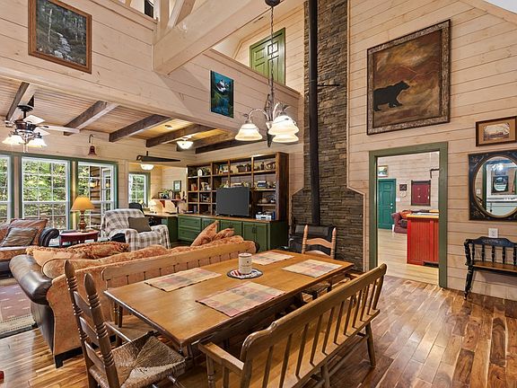 Take the road less traveled to the Old Mill Cabin, where seclusion, mountain beauty, and the sounds of rushing water create the perfect escape. Nestled at the private end of the road and adjoining the National Forest, this fully furnished, turn-key, 3 bedroom, 2.5 bathroom, mountain lodge feels like a true wilderness retreat. Enjoy the soothing sounds of babbling Suches Creek from the spacious party deck along the water's edge, the perfect spot for relaxing or entertaining in the fresh mountain air. Two large rocking chair porches welcome you home & frame the wooded setting beautifully, while the open great room with wood floors, exposed beams, & warm wood walls gives the home an authentic lodge style ambiance. Inside, you'll find two wood stoves with rock accented hearth & wall, one in the main living area and one in the kitchen keeping roomproviding cozy fires on chilly Suches evenings. The loft with twin beds is ideal for extra guests or a reading nook, while the separate upstairs bedroom with private half bath offers peaceful privacy. There are ample closets & storage areas, a fenced yard for pets, & a circular driveway with plenty of parking for guests. Modern conveniences include fiber-optic internet, making it easy to stay connected while surrounded by nature. The large front porch overlooks an area where a spring fed trout pond could be restored & once was located, while the open rear deck leads to a grilling area & into miles of scenic hiking trails through the adjoining National Forest. Located in the heart of Suches, surrounded by excellent hiking and biking trails, pristine trout streams, and Lake Winfield Scott, this cabin captures all the best of the North Georgia Mountains, high elevation, cool breezes, and timeless tranquility. Whether you're looking for a private getaway or an exceptional short term rental investment, the Old Mill Cabin is a rare find that blends rustic charm with natural beauty. Please, no drive by's.