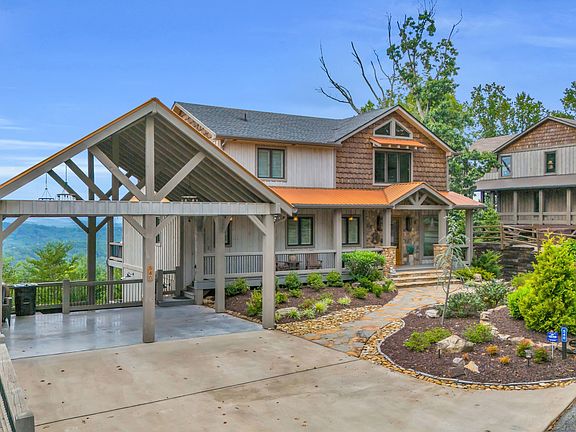 Showcased in the 2021 Blue Ridge Parade of Homes and built by renowned craftsman Kevin Teague, this custom 4,200+ square foot mountain estate in the prestigious gated community of Blue Ridge Heights offers elevated design, exceptional finishes, and panoramic year-round mountain views. As an added bonus, the seller is offering an allowance to install custom built-in bunks in the office/gym area-perfect for maximizing sleeping space or accommodating guests. The seller has already consulted with Kevin Teague to ensure the addition would seamlessly integrate with the home's original design. Set on a gently rolling 1.07-acre corner lot-bordered by three unbuildable lots that protect privacy and views-this home blends concrete frame construction with warm wood siding in a striking craftsman-contemporary style. Inside, premium materials include Acacia wood floors, Aspen wood ceilings, ash floating staircases with LED lighting, and a blend of drywall, natural wood, and shiplap for added warmth and texture. The owner's suite offers deck access, a walk-in closet, and a spa-style bath with tile shower, granite double vanity, and shiplap detailing. A dramatic glass walkway floats above the living room and main deck, leading to an outdoor glass-walled patio, both illuminated by smartphone-controlled multi-color LED lighting. Upstairs includes a loft with sweeping views and a guest suite with private deck and full bath. The terrace level adds a second living area with fireplace, wet bar, guest suite, flex/office space, half bath, storage, and a third expansive Trex deck with another fireplace. Outside features include a fire pit, custom rockwork, copper roof accents, two covered parking spaces, and full smart home tech. A whole-home Generac generator, two HVAC units, and 8 TVs complete the package. With refined finishes and a one-of-a-kind layout, this mountain retreat must be experienced in person to fully appreciate its scale, quality, and unforgettable setting.