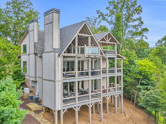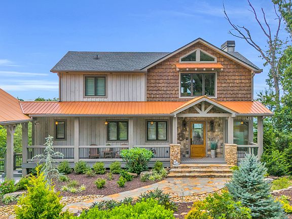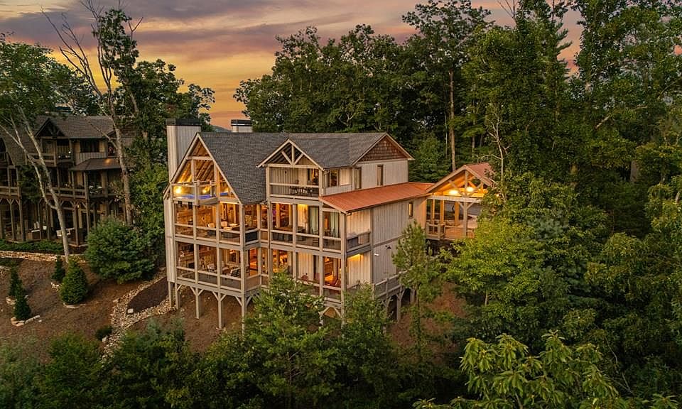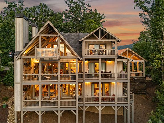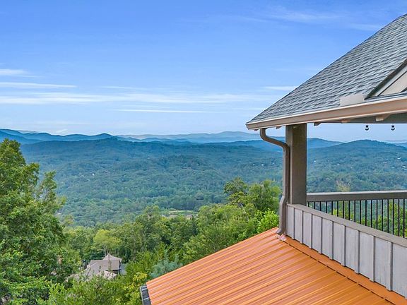 **Priced Below Recent Appraised Value** Elevating mountain living to an art form, this 4,800 square foot custom estate in the prestigious gated community of Blue Ridge Heights was showcased in the 2021 Blue Ridge Parade of Homes and masterfully built by acclaimed craftsman Kevin Teague. Set on a gently rolling 1.07-acre corner lot bordered by three unbuildable parcels for privacy, the home offers sweeping, year-round mountain views and a seamless blend of modern luxury and timeless craftsman design. Concrete frame construction is softened by warm wood siding, while inside, Acacia wood floors, Aspen wood ceilings, and floating ash staircases with integrated LED lighting flow throughout, complemented by a mix of drywall, natural wood, and shiplap that adds warmth and texture. The owner's suite offers deck access, a walk-in closet, and a spa-inspired bath with granite double vanities, shiplap detailing, and a tiled shower. A dramatic glass walkway floats above the living room, connecting the main deck to a glass-walled outdoor patio, both enhanced with smartphone-controlled LED lighting. Upstairs, a loft with panoramic views and a guest suite with private deck provide serene retreats, while the terrace level adds a second living area, wet bar, guest suite, flexible office or gym space, half bath, storage, and an expansive Trex deck with fireplace. The seller is offering an allowance for custom built-in bunks in the office or gym area, designed with Kevin Teague to integrate seamlessly. Outdoor amenities include a fire pit, custom rockwork, copper roof accents, and two covered parking spaces, while full smart home technology, a whole-home Generac generator, dual HVAC units, and eight mounted TVs provide complete convenience. With refined finishes, a unique layout, and unmatched mountain views, this Kevin Teague Parade of Homes estate offers a rare opportunity to own a home of exceptional craftsmanship in an unforgettable setting.
