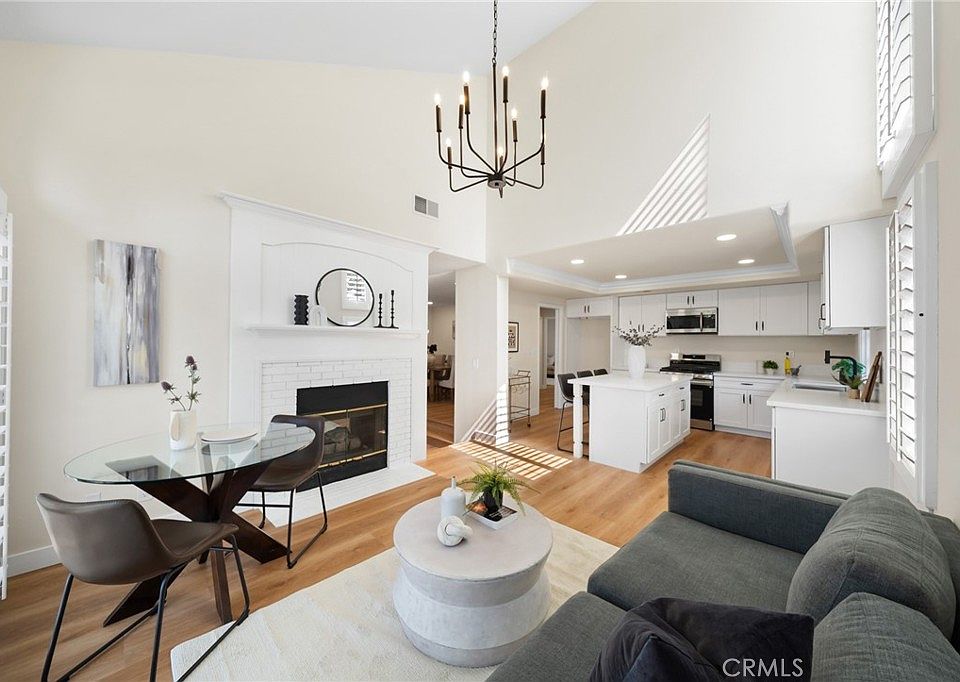 The heart of the home is a beautifully remodeled kitchen, complete with crisp white shaker cabinetry, gleaming countertops, and brand-new, state-of-the-art appliances. An expansive formal dining room overlooks the sunken living room, where a striking dual-sided fireplace creates a warm, inviting ambiance between the living area and the cozy den.