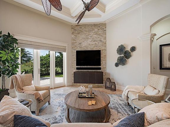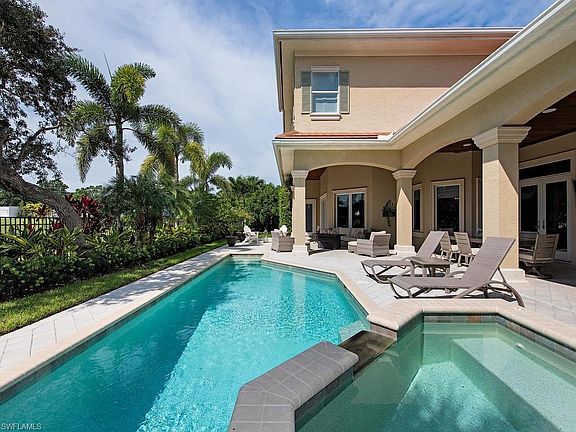 Magnificent southern facing custom estate home offers exquisite custom wood craftsmanship and designer details throughout. The open floorplan flows seamlessly beneath soaring ceilings on the first floor, formal living room with fireplace, eat-in gourmet kitchen, formal dining room, family room; master suite, two guest bedrooms, den. Second master suite and huge recreation room on second level. Golf course views off the spacious covered lanai add to the special ambiance of this home and feature cedar ceiling, pool, spa, outdoor kitchen and fireplace; perfect for all day and evening entertaining! Lush landscaping compliments the luxurious tropical feel of this beautiful home; 3-car garage with circular driveway provides plenty of parking for owners and guests. Close to the private Moorings Beach Park; minutes from Old Naples, this south facing home is flooded with natural light. Beautifully furnished; furnishings negotiable. Full-house generator; 500 gallon buried propane tank. Original owners have meticulously maintained this home in mint condition. Come see this beautiful, unique home where you will live the Naples lifestyle you seek.