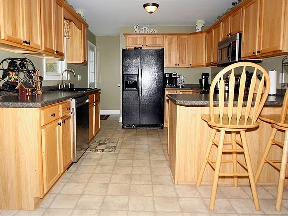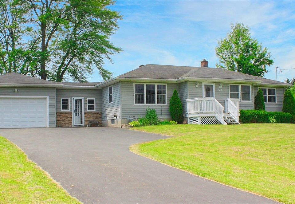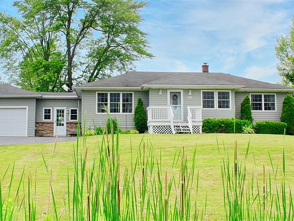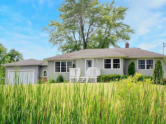 Looking for peace, privacy and serenity? This wonderful 3 bedroom 1 bath maintenance free vinyl sided ranch on approximate one acre lot offers just that. Sitting high and dry with a nice setback from the road, home features an attached garage along with a mud room breezeway that allows front and back entry to the home. Fabulous expanded backyard concrete patio with both canvas awning and open air sitting. All enhanced with beautiful backyard landscaped grounds. Kitchen features modern day cabinets and plentiful cupboard and countertop. Large full poured concrete basement with glass block windows. Hardwood floors. Updated vinyl clad windows. Basement stairwell features pull down ladder access to overhead attic storage. Open Houses both Saturday (6/22/24) and Sunday (6/23/24) from 1-3 pm.