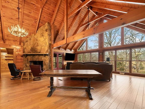 Experience the pinnacle of North Georgia luxury in this stunning riverfront retreat nestled in the heart of the Chattahoochee National Forest. Set on 2 private acres within a gated, rental-restricted community, this 3-bedroom, 3-bathroom home boasts 95 feet of pristine Toccoa River frontage, blending rustic charm with modern elegance. Step inside to a sun-drenched open floor plan with gleaming hardwood floors and thoughtfully designed living spaces. The gourmet kitchen flows seamlessly into the great room, where a wall of windows frames breathtaking river views. The fully finished basement adds valuable space with a full bedroom and bathroom—perfect for guests or a private retreat. The primary suite offers a spa-like escape with an upgraded steam shower. Outdoor living is reimagined with a private courtyard featuring a $70,000 hot tub/swim spa combo, outdoor kitchen, and firepit. Down by the river, enjoy quiet moments in your private gazebo swing overlooking grassy fields and abundant wildlife. Adventure lovers will enjoy rafting and kayaking on the Toccoa River, which flows directly into Blue Ridge Lake for even more recreation. A detached guest cottage/workshop provides flexible space, while a newly installed Generac generator (valued at $10,000) powers the entire home. A storage shed is also included for outdoor gear. Whether you're seeking a full-time residence or a serene getaway, this riverfront oasis offers the perfect blend of luxury, privacy, and nature—just a short drive from downtown Blue Ridge. Now offered at $799,000—call today to schedule your private tour!