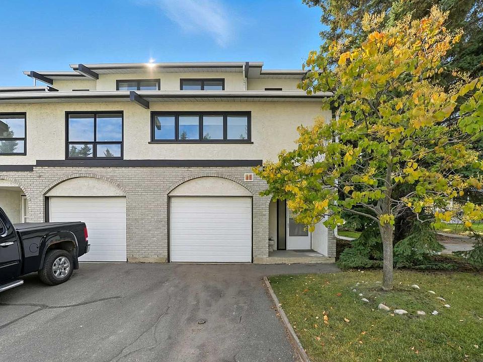Rare Opportunity in Dalhousie! Welcome to this beautifully maintained 2 bedroom, 2 bathroom end-unit townhouse with an attached front garage in one of NW Calgary’s most desirable communities. Offering a spacious and functional layout, this home features gleaming hardwood floors, a renovated kitchen with quartz countertops, high-end stainless steel appliances, and clever built-in booth seating with extra storage. Enjoy hosting in the bright, open living and dining area with soaring ceilings, a wood-burning fireplace, and access to a covered balcony – perfect for morning coffee or evening relaxation. The private backyard provides additional outdoor living space, rare for townhome living. The king-sized primary bedroom includes ample closet space, while the oversized attached garage adds comfort and convenience. This pet-friendly complex is known for its exceptional amenity centre, featuring an indoor pool, sauna, squash court, gym, games room, and party lounge – all included with very reasonable condo fees. Located close to schools, parks, shopping, transit, and more. Don’t miss your chance to own this unique home in a vibrant and well-managed community!
