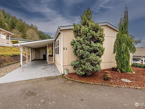 Welcome to this spacious and tastefully updated home in Columbia Terrace Estates! Nice open floorplan with living and family rooms open to kitchen and dining area. Fully remodeled kitchen w/ Corian-type countertops, new cabinets with pull outs, and stainless appliances. Primary bedroom has vaulted ceiling, walk in closet, and updated bath with new vanity and fixtures. Two additional bedrooms and full bath. Carport, shed, patio, and concrete walk to front porch. Long driveway sets home back from road, nicely landscaped all around with low maintenance shrubbery. Nicely kept park with no age restrictions. RV parking available in park. Common greenspaces and territorial views of the surrounding hills. Kalama & Columbia River recreation nearby!
