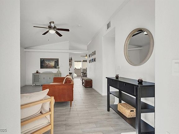 Absolutely gorgeous single-story condo/home in a quiet, gated community with a pool, spa, clubhouse, BBQ/picnic areas, guest parking, and separate RV parking. Centrally located with easy access to schools, shopping, freeways, and the world-class entertainment of the Las Vegas Strip. This open floor plan features custom flooring, designer paint, and an oversized family room filled with natural light. The chef’s dream kitchen boasts stainless steel appliances and upgraded level 3 countertops. The spacious primary suite offers a spa-like bath with a custom walk-in shower and large walk-in closets. The secondary bedroom is complemented by a beautifully remodeled hall bath. Enjoy a private courtyard with a covered patio—perfect for relaxing or entertaining. The attached two-car garage includes storage cabinets and remotes, with guest parking conveniently located right outside. This move-in-ready home shows true pride of ownership—don’t miss your chance, schedule your showing today!