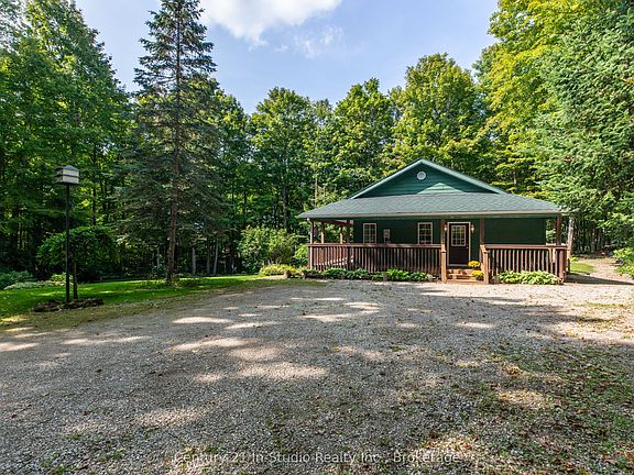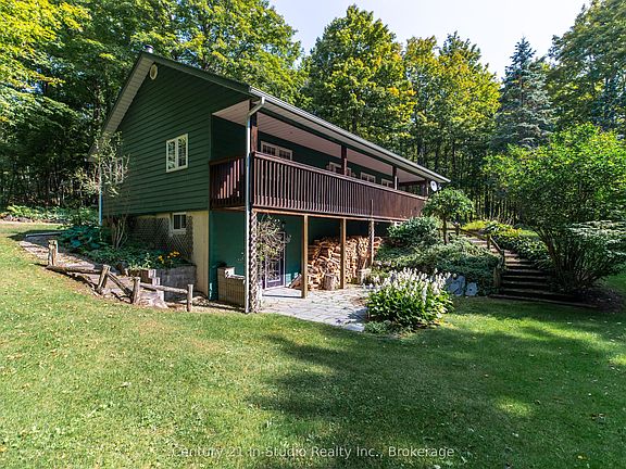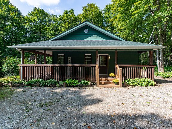 Set on a picturesque, nicely treed 1.44-acre lot, this well-maintained Viceroy home offers the peaceful country lifestyle you've been dreaming of and located 10 minutes from Markdale. Step onto the wrap-around covered porch and into the open-concept living space, complete with new skylights that bring in an abundance of natural light. The main floor features two bedrooms, including a spacious primary bedroom, two bathrooms, and an open-concept living area. The finished basement includes a walk-out to a patio, tall ceilings, a cozy wood stove, a spacious recreation room, a bonus room, and a roughed-in four-piece bathroom, perfect for additional living space or guest accommodation. Recent updates and features include new skylights, fresh paint, and updated flooring on the main level. Additionally, the house has a newer shingled roof, a heat recovery ventilation (HRV) system, a hot water tank, a water treatment system with UV light, and an owned water softener. Enjoy the serenity of the landscaped yard, where you will find a small decorative pond and a shed for extra storage or hobbies.Located in Chatsworth Township, known for its quiet beauty and peaceful charm, you are close to the heart of Grey County, a haven for outdoor recreation year-round. From hiking and skiing to paddling and scenic touring, adventure is never far away. Built by the original owners, this property offers the perfect balance of comfort, privacy, and access to the best of Grey County. Schedule a showing today!