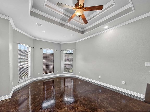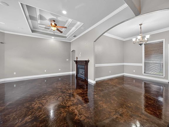Tucked away in a cul de sac in the gated community of Williamsburg Village, this beautifully maintained custom home offers modern upgrades throughout. From the moment you arrive, thoughtful architectural details set this home apart. Arched garage doors, detailed brickwork, and an eight-foot entry door create a grand and inviting entrance. Inside, stained and recently polished concrete floors flow beneath ten-to-eleven-foot ceilings, enhanced by crown molding and a carved fireplace mantel. The open layout provides seamless transitions between living, dining, and outdoor spaces. The kitchen is designed for both function and style, featuring solid wood cabinetry, slab granite countertops, a gas cooktop, built in oven and microwave, and new full-size deep sink. Adjacent laundry room offers a drip-dry rod, and a new washer and dryer that will also convey. The oversized garage is approximately twenty-five feet deep, offering extra space for tools, storage, or hobby areas. The split floorplan includes two spacious bedrooms with tray ceilings and a full bathroom. The primary suite includes double tray ceilings, backyard views, and an en suite bath with separate vanities, a walk-in shower and a separate walk-in soaking tub. Outside, enjoy the covered back patio and a spacious, tree-shaded backyard enclosed by brick walls and privacy fencing—ideal for outdoor enjoyment and relaxation. Recent updates include a new roof (1 month), new tankless water heater, new microwave, new carpet, and fresh interior paint. The AC was replaced one year ago. Additional features include PEX plumbing with individual shutoff valves, an alarm system, automatic sprinkler system, and a new brick mailbox. This move in ready home offers quality construction, privacy, and convenience.