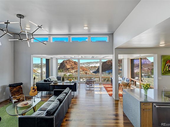 Set upon a private 1-acre lot that backs to pristine open space, with Pike National Forest just beyond, this architectural home seamlessly blends modern design with the unparalleled beauty of Colorado’s natural landscape. Reimagined and completely renovated with additional living space, this home fosters connection with loved ones, the stunning environment, and a lifestyle of comfort and serenity. 180-degree panoramic views capture the essence of the area’s iconic scenery. From Downtown Denver to the shimmering waters on Chatfield Reservoir, Carpenter Peak, striking red rock formations and rugged hogbacks of Roxborough State Park, every vista immerses you in the foothills’ dramatic landscapes. Daily sunrises and moonlit horizons grace the home, while abundant wildlife adds to the serene ambiance. Outdoor living spaces on every level further enhance this home’s integration with nature. Expansive decks, terraces, and patios provide perfect spaces for entertaining, relaxing, or simply soaking in the surrounding beauty, & make every corner of this property an invitation to enjoy the outdoors. Inside, the home is filled with natural light, offering thoughtfully designed spaces that maximize comfort and functionality. The oversized home studio serves as a peaceful retreat, ideal for a home office, library, or creative space. Every bedroom features sweeping views of the rock formations, including a guest suite with an en suite bath, offering privacy and luxury for family or visitors. Modern conveniences elevate this home’s livability. A heated driveway ensures easy year-round access and a discreet dumbwaiter from the garage to the kitchen adds seamless practicality to everyday life. This one-of-a-kind property is more than just a home; it’s a lifestyle. A harmonious blend of modern luxury and natural beauty, this Roxborough Park retreat offers an unmatched connection to nature, loved ones, and the stunning world around you. Go to 5401AntlerRun.com for more information.