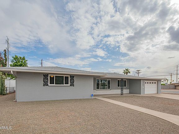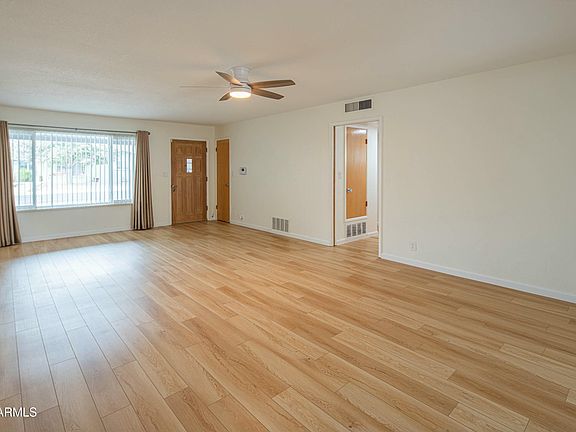 **EXPANSIVE CORNER LOT WITH RV GATE** Recently updated gem located in 55+ age-restricted Dreamland Villa. This Farnsworth block home features larger living spaces, vinyl plank floors in main areas, and a myriad of recent updates mixed with mid-century charm. Updated kitchen with newer stainless appliances, quartz countertops, and hardwood cabinetry. Primary suite features separate closets, an expansive vanity area with dual sinks, and a tiled walk-in shower. Guest bedroom is larger and features new carpet and close access to the guest bathroom. Guest bathroom features a tiled shower/tub area, and stone countertops. Arizona Room/Bonus Room is fully enclosed with its own AC system. Backyard is low maintenance, fully fenced and has an RV Gate for RV, boat or trailer storage. Home also has dual pane windows (2020), newer water heater (2024) and an upgraded HVAC system (2018). Located in Dreamland Villa, which offers its residents the option to purchase a membership for clubhouse amenities and activities. Located within just a few miles of the US60, Loop 202, along with a wide selection of dining and entertainment options nearby.