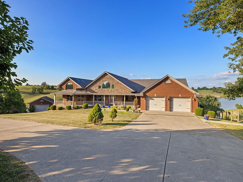 Experience lakeside living on Greenbrier Lake in this custom-built residence offering more than 6,600 square feet of thoughtfully designed space. With nearly two acres that roll gently toward the water, the setting provides privacy, wide open lake views, and a natural backdrop for both gathering and retreat. The main level features hardwood floors, custom cabinetry, and soaring ceilings, with each bedroom designed as a private suite with its own bath. A large sunroom, ideal as an office or additional family space, captures sunlight and views throughout the day. The home's lower level offers a full second kitchen, living and dining areas, utility room, and a stone fireplace, making it well-suited for multigenerational living or guest quarters. In total, the home offers five bedrooms, a theater room with 12-inch poured concrete walls, and architectural details like a dramatic winding staircase beneath the soaring great room ceiling. Outdoor living is equally inviting, with expansive decks and patios overlooking the lake and access to the water only steps away. The rural setting offers the tranquility of a waterfront retreat yet remains just 3.5 miles from everyday conveniences, and a short drive to Lexington via I-64. This is a rare opportunity to own a spacious waterfront home that blends craftsmanship, functionality, and setting in one exceptional property.