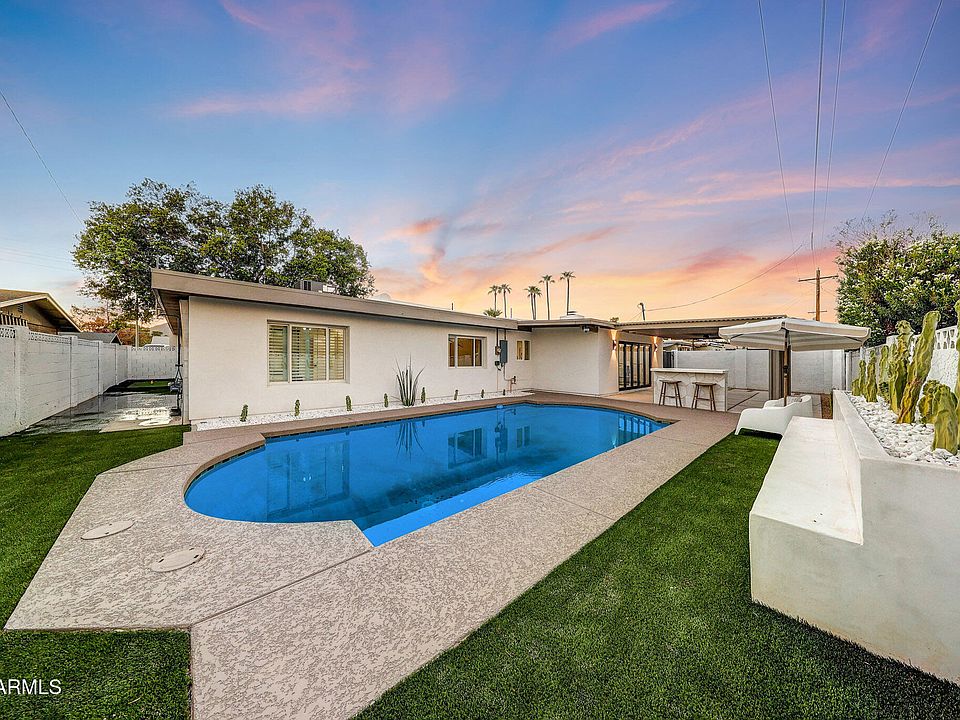 Welcome to your ultimate entertainer's paradise! This beautifully remodeled 4-bedroom, 3-bath home blends modern luxury with timeless comfort. Behind a custom iron front door, you're greeted by an open, light-filled floor plan designed for today's lifestyle. The gourmet kitchen is a true showpiece—featuring a gas range, all-new cabinetry, an 8-foot island with a quartz waterfall countertop, elegant counter-to-ceiling backsplash, and a custom plastered hood vent. The space flows seamlessly into the spacious living area, where a statement fireplace wrapped in luxury tile anchors the room. The primary suite is a true retreat with a spa-inspired bathroom featuring a seamless walk-in shower, freestanding soaking tub, and a generous walk-in closet. Three additional bedrooms include a private en-suite, ideal for guests, in-laws, or a home office. A 5-panel accordion door opens to the stunning backyard, creating the perfect indoor-outdoor experience. Enjoy dinner beneath the designer chandelier and custom floating shelves in the dining area, or step outside to your private Southwest oasiscomplete with low-maintenance synthetic turf, a micro-cement seating area and planter, an outdoor island, an expansive pergola for shade, a two-tone tiled pool, an Outdoor Shower, and even a putting green! Every detail has been thoughtfully updatednew smooth wall finishes throughout, new cabinetry, epoxy garage floors, exterior synthetic stucco, roof, HVAC, electrical, and garage door. Every element has been professionally designed for both style and function. Located in a highly desirable neighborhood within walking distance to Chaparral Park and just minutes from Old Town Scottsdale's top dining and shopping, this home offers the best of Arizona living. This turnkey entertainer's dream is ready for you to move in and enjoyevery detail perfected, inside and out. Owner/Agent.