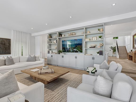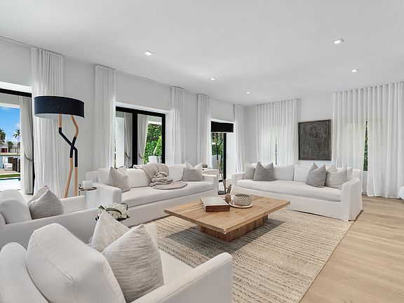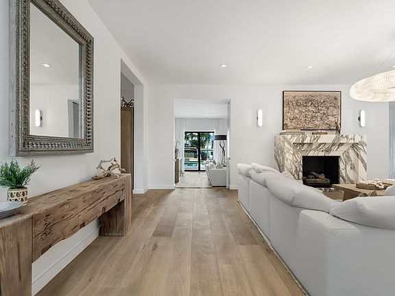 Step Inside with Me! A Menin Homes designed waterfront villa on esteemed Pinetree Drive greets with an idyllic courtyard and lush greenery. This distinctive contemporary house boasts arched doorways, oak floors, and dual lounges adorned with custom millwork and a marble fireplace. An Italkraft kitchen provides sophistication and warmth with paneled cabinetry, eat-in island & marble counters. The upper level features 4 suites including a waterfront primary with dual walk-in closets, marble-encased grand shower, a showpiece bathtub, and spacious sunrise terrace. The expansive backyard is experienced through a covered loggia, chic cabana bath, built-in BBQ, ample greenspace, T-dock & beloved Eastern breezes. A 2-car garage, security cameras, and 75 FT of water frontage complete this offering.