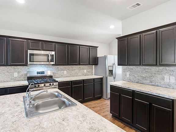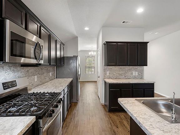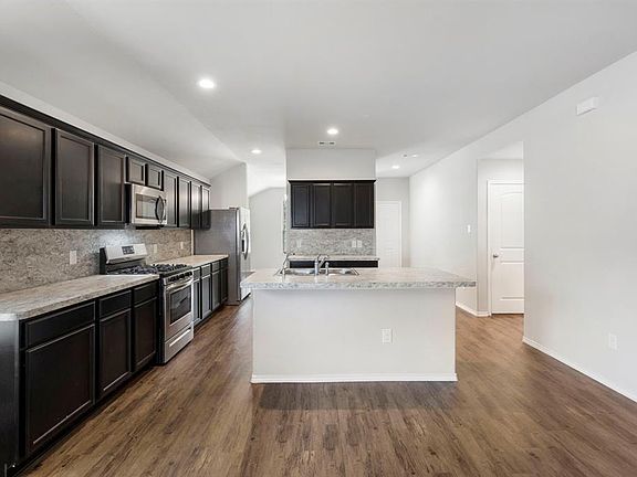 MOVE IN READY TODAY! Just like new single story home. Laminate wood floors throughout the main living. Formal dining and large family room open to the kitchen. Eat at island kitchen with stainless steel appliances, ample cabinetry, counterspace and walk-in pantry. Primary bed with en-suite bath, double sinks, free standing shower and bath. Large walk-in closet. Two additional beds. Fenced back yard with covered patio. Tankless water heater. Washer and dryer included.