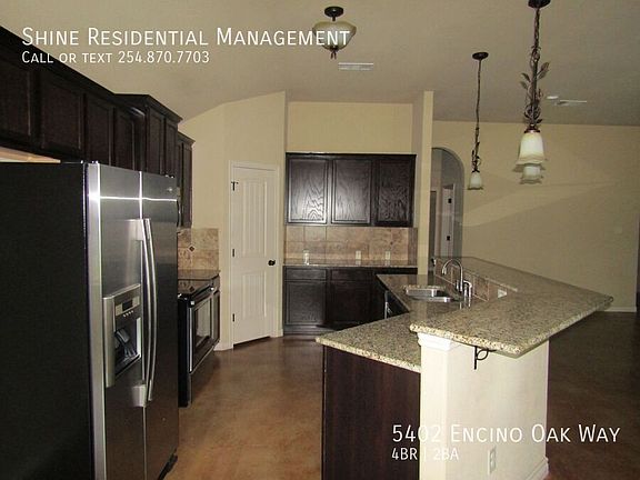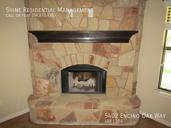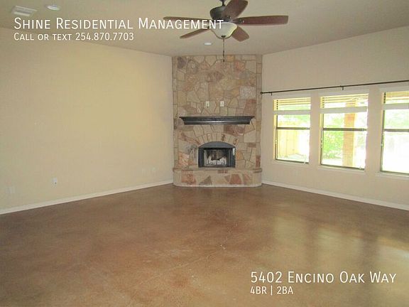 Don't pass up this gorgeous 4 bedroom, 2 baths, 1944 sqft home with 1 living and 1 dining located in the Spanish Oaks subdivision. Walk into an open concept living, kitchen dining with a fireplace and stained concrete floors throughout. The kitchen features dark finished cabinets, granite countertops, stainless steel appliances, and a walk-in pantry. The master is large enough to fit a king-sized bed and features an en-suite bathroom. The master offers a separate shower with double shower heads, jetted oversized tub, walk-in closet and his and her's sinks. The fenced backyard offers a shed and large covered patio. This property accepts pets. Call us today for a showing.