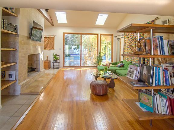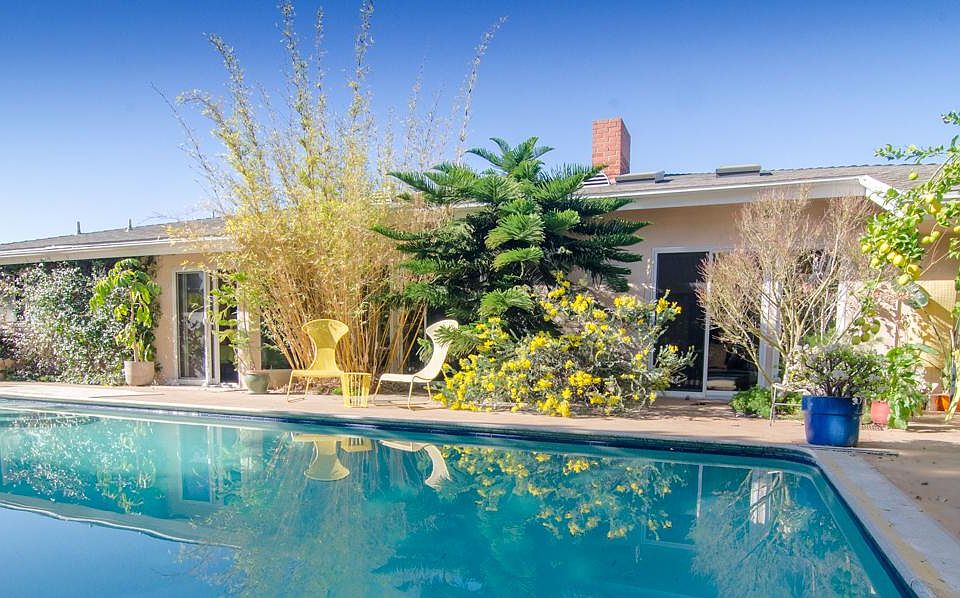 Renovated mid-century modern home with original pool. 4 bedrooms, 3 bathrooms (plus 2 half-baths!), oak and tile floors, and large windows. Living and dining rooms well appointed with mid-century furniture, high ceilings and skylights. The floor-to-ceiling glass doors open on to the lush garden, patio with chaises longues, a warm swimming pool (36x 15 & 9 feet deep) with motorized cover. Barbecue and dine poolside and the fire pit in the evenings.