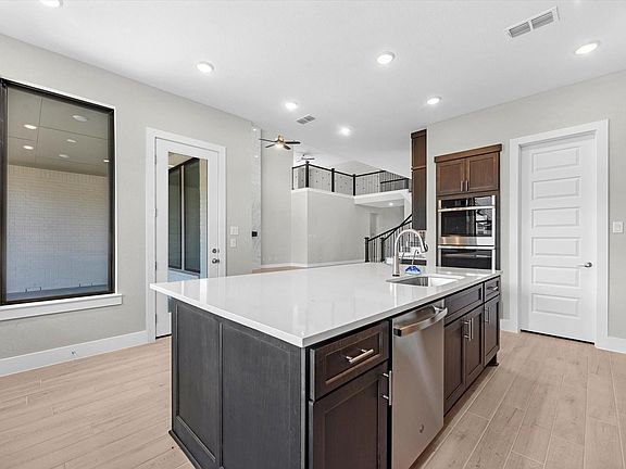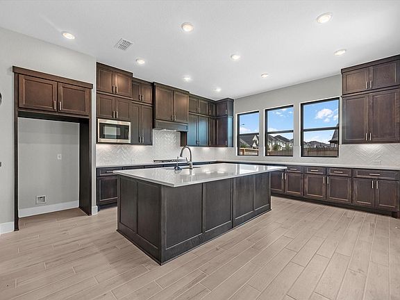 The Camberly - This stunning two-story home greets you with a charming porch and grand foyer featuring a curved staircase. The open floorplan connects the gourmet kitchen, great room, and breakfast area, perfect for entertaining. The kitchen boasts GE appliances, a 36" gas cooktop, Tahoe Maple Storm cabinetry, Carrara Morro Quartz countertops, and a Costa Clara Cloud tile backsplash. Host dinners in the elegant formal dining room and enjoy a private home office. The luxurious primary suite includes a tray ceiling, dual vanities,a free-standing bath, and a walk-in closet. Upstairs, enjoy the game room or media room.Relax on the covered patio after a long day.