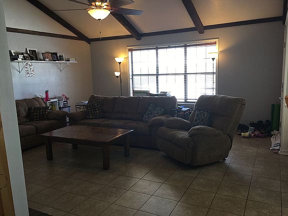 Golden Meadows neighborhood, brick house with privacy fence. Two car garage with paved driveway for more parking. Open floor plan, large living room, nice fireplace, lots of shelving and closets for storage, tile floor throughout with carpet in bedrooms only. We moved into this house in 2018 and repainted, painted the brown cabinets white, got a new roof, replaced the back door, and remodeled the master bathroom with new tile and nice double marble vanity. Very nice and clean house. We’re moving on 1 June 2021 and cannot sell the home before then. Please contact Clark for more information at eight05-seven57-zero254.