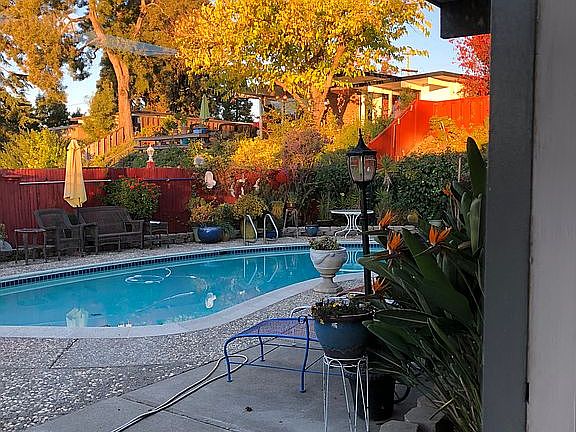 This is a Eichler home with an Atrium entry, new real wood floors In all but 2 of the bedrooms and bathrooms. There is a swimming pool and patio with deck and gorgeous views of the bay including the San Mateo Bridge! Built in BBQ Island with Lighted Propane Gas Grille. Two raised bed garden boxes (all redwood exterior).