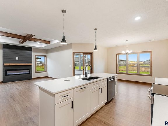 Low-Maintenance Luxury on the West Side of Sioux Falls! This stunning slab-on-grade home combines style, comfort, and convenience in one perfect package. Nestled on the growing west side, you’ll enjoy easy access to new shops, restaurants, and main roads—all while living in a home designed for low-maintenance living. Inside, the open-concept layout showcases a beautiful blend of antique white and toffee cabinetry, quartz countertops with a Blanco undermount sink, and a stylish backsplash. The kitchen is anchored by pantry cabinets flanking the refrigerator for added storage. Stainless steel appliances included. A trayed ceiling with cross beams elevates the living room, where a shiplap fireplace wall with a sleek electric linear fireplace creates the perfect focal point. The primary suite is complete with a step-in shower, dual quartz-topped vanities with undermount sinks, and modern black fixtures. Double glass French doors lead to a bright sunroom and out to a rear concrete patio, ideal for relaxing or entertaining. Additional highlights include an oversized 940 sq. ft. triple garage (fully sheetrocked), an upgraded walnut-finished front door with stone accents, and an energy-efficient furnace with central A/C. Sod, sprinkler, rock, and edging included in the price.