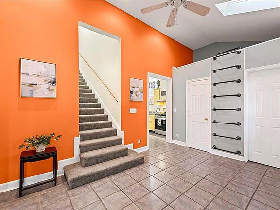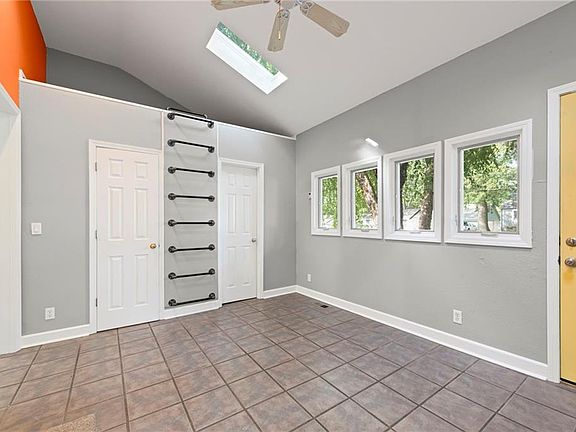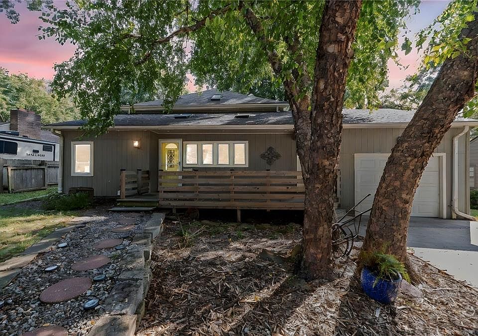 Drive along a charming, tree-lined street to discover this distinctive 1.5-story home tucked among mature trees. An extra-wide driveway and tandem two-car detached garage offer ample parking, while a curved paver walkway with solar inset lights leads you to the welcoming front porch. Steps from the garage connect directly to the front deck for added convenience. Inside, natural light pours through skylights in the living room, highlighting the playful loft nook perched above the walk-in mudroom closet. To the left, a flexible bedroom or office with laminate floors connects to a hallway leading to a laundry room and full bath with a double vanity and tile flooring. The spacious back bedroom also features laminate flooring, a ceiling fan, and private access to the inviting family room—complete with a large bay window, French doors, and seamless access to the covered deck and paver patio overlooking the fenced backyard. The kitchen, with its cheerful painted cabinets, tile flooring, gas stove, and broom pantry, opens to the living room through a convenient pass-through. A half bath is thoughtfully located between the kitchen and front living room. Upstairs, the expansive owner’s suite spans the entire back of the home and includes a modern en suite bath with a quartz double vanity, shower/tub combo, skylight, and walk-in closet. A third bedroom with skylight and an additional full bath complete the upper level. The long, fully fenced backyard includes a storage shed and plenty of room for play or gardening. With its distinctive modern roofline, creative layout, and tree-filled setting, this home is brimming with character and charm.
