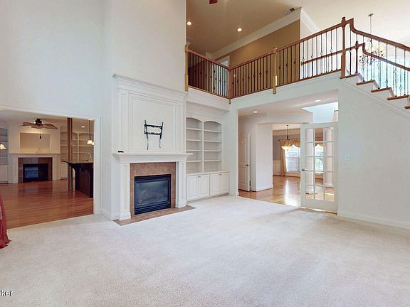 From the moment you step into the grand two-story foyer, you're greeted by an open-concept design flooded with natural light from oversized custom windows. The elegant great room features soaring vaulted ceilings, exquisite woodwork, and built-in cabinetry surrounding a cozy fireplace—perfect for entertaining or relaxing. The formal dining room flows seamlessly into the kitchen, complete with custom cabinetry, ample counter space, and a separate breakfast area that opens to your newly replaced, backyard deckideal for morning coffee or evening gatherings while enjoying the peaceful wooded views. Adjacent to the kitchen is a hearth room with a second fireplace, more custom built-ins, and rich hardwood floors that add warmth and character.