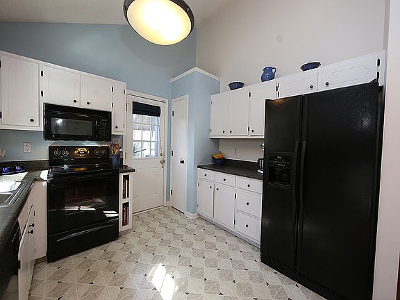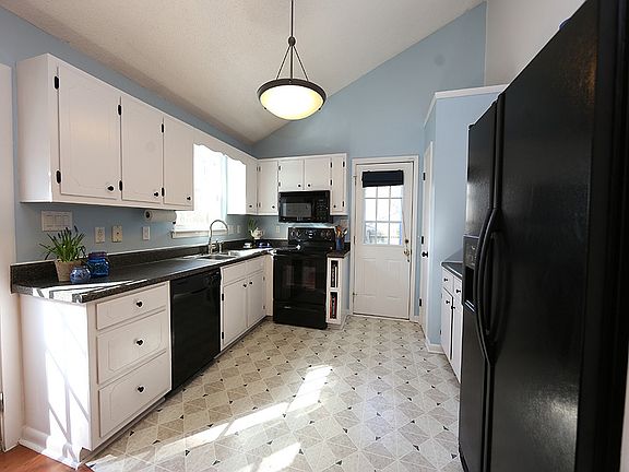 Well maintained & updated Ranch-style home w/covered porch on almost .5 acre homesite. Easy maintenance vinyl exterior. Living room w/laminate hardwoods, vaulted ceiling & masonry fireplace. Dining room opens to kitchen w/lots of cabinets, pantry & newer black appliances including refrigerator. Master suite w/carpet, walk-in closet & private bath w/tub/shower. 2 additional bedrooms & hall bath w/new tile floor. Large deck in fenced backyard w/storage building, covered shelter & playset. No HOA dues!!!