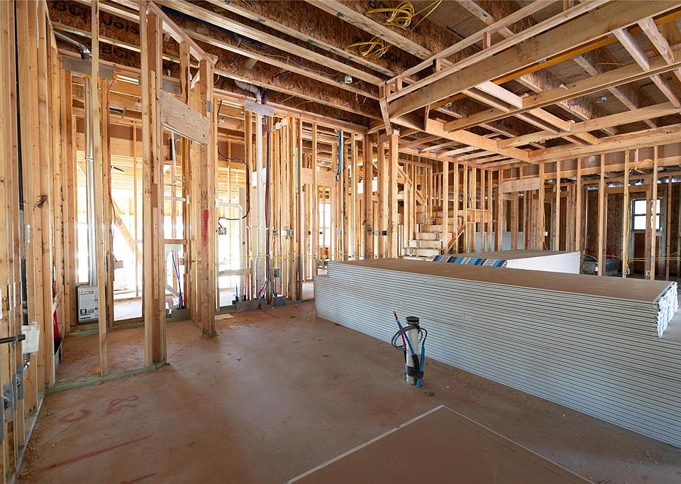 This Hazel Bonus Room 5 Bedroom has 2,735 Sqft of total living space, which includes 2,520 Sqft of indoor living space and 215 Sqft of outdoor living space. This two-story luxury home offers 5 bedrooms, 3 full baths, 2 covered patios, a spacious bonus room, a large utility room featuring a utility sink, a custom-built 8' front door, and a 3-car garage with carriage doors and an in-ground storm shelter installed. The living room presents a stacked stone corner gas fireplace, a 3-panel sliding door with a 4’ back patio extension, wood-look tile, Cat6 wiring, rocker switches throughout, and an impeccable coffered ceiling with a ceiling fan and crown molding. The kitchen supports stainless steel appliances, including a 5-burner cooktop and double ovens, custom-built cabinets to the ceiling with cabinet hardware and under cabinet lighting, 3 CM countertops, stunning pendant lighting, a large corner pantry, modern tile backsplash, and an oversized island with a built-in trash can pullout. The primary suite offers a sloped ceiling with a ceiling fan, windows, and our cozy carpet finish. The prime bath features a dual sink vanity with framed mirrors, a free-standing tub, a walk-in shower, a private water closet, and a HUGE walk-in closet. Covered outdoor living boasts a wood-burning fireplace, a gas line for your grill, and a TV hookup for your flatscreen. This home also offers our healthy home technology, a tankless water heater, a whole home air filtration system, R-44 insulation, and more!