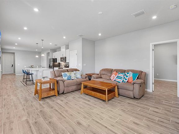 Located in the desirable gated community of Moss Creek, this beautifully maintained 3-bedroom, 2-bathroom home sits on a spacious corner lot and offers modern comfort with thoughtful design. Built in 2021, this residence is move-in ready and perfectly blends style, function, and convenience. As you enter, you’re greeted by a bright and airy open-concept living area, seamlessly connecting the living room and kitchen—ideal for entertaining or everyday living. The main living space features wood-look tile flooring, which also extends into the primary suite for a cohesive and modern feel. The kitchen is a true showstopper, boasting tall cabinetry, stainless steel appliances, a generous kitchen island with bar seating, and recessed lighting that enhances the clean, contemporary aesthetic. Step through the sliding glass doors to enjoy Florida living at its finest in the screened-in, enclosed patio—perfect for morning coffee or relaxing evenings. The primary bedroom suite offers a spacious retreat with a large walk-in closet and a luxurious en suite bath, complete with dual sinks, a water closet, and a walk-in shower. The two additional bedrooms are well-sized and feature plush, well-maintained carpet. Additional highlights include a laundry room, two-car garage, and energy-efficient design elements throughout. Enjoy the perks of Moss Creek, a gated community featuring a clubhouse, resort-style pool, and beautifully maintained common areas. Conveniently located near shopping centers, restaurants, supermarkets, and just a short drive to stunning Gulf Coast beaches, including the world-famous Anna Maria Island. Don’t miss your chance to own this exceptional home in one of Bradenton’s most sought-after communities. Schedule your private showing today!