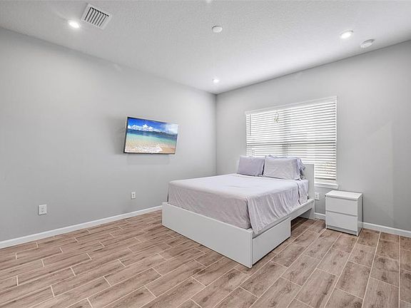 En suite bathLaundry roomCorner lotWood-look tile flooringScreened-in enclosed patioRecessed lightingPrimary bedroom suite