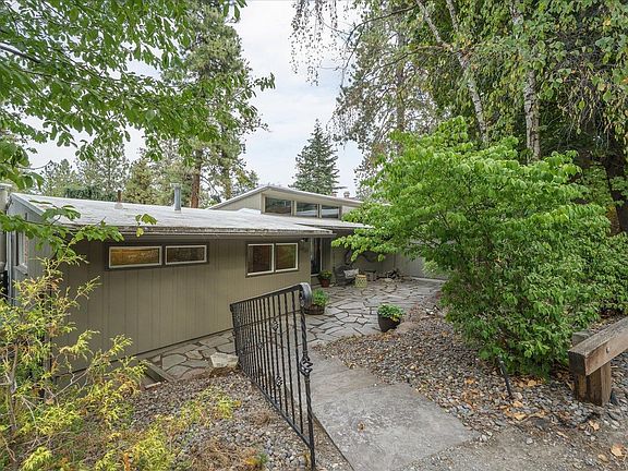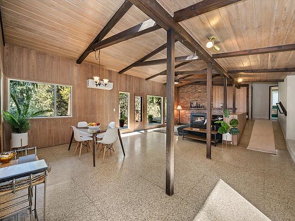 PEEK a BOO VIEW! !!!Artistic 1947 Mid-Century Modern Rancher Nestled on a serene .79-acre lot yet conveniently close to town, schools, & shopping, this 1947 mid-century modern rancher is a masterpiece of design & comfort. Thoughtfully updated in 2018, w/ stunning remodeled kitchen with a Thor gas cooktop, granite countertops, and all-newer custom cabinetry. The open floor plan is accentuated by radiant floor heating & classic terrazzo flooring w/newer mini-split systems for energy-efficient AC.The main bedroom is a cozy retreat, complete with a wood-burning fireplace and sliders that lead to a private patio, perfect for soaking in the tranquility of the lush, fenced backyard. Both front and rear patios offer inviting spaces for outdoor relaxation, surrounded by deciduous trees & garden area.The daylight walkout basement adds a spacious bedroom and a ¾ bathroom, making it ideal for a private ADU or guest suite. Also a two-car carport, a storage building, & ample garden space, making this the perfect retreat.