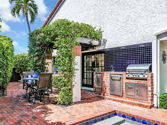 Welcome to your private tropical oasis! Nestled in the hidden gem of Bay Villas within Pelican Bay, this 3 bedroom, 2 bathroom villa offers bright and airy living spaces. French doors open from every room to a private landscaped courtyard with an expanded brick-paver patio and private heated pool & spa, creating the perfect setting for indoor-outdoor living! Entertain with ease in the custom outdoor kitchen featuring a built-in grill, beverage fridge, ice maker, sink, and stylish tile finishes. Surrounded by lush landscaping, this resort-style space also includes a private outdoor shower for the ultimate tropical retreat. Inside the villa, soaring vaulted ceilings & walls of windows add tons of natural light throughout the living spaces. Offered turnkey furnished with numerous upgrades, this home features coastal décor & furnishings, wood floors, plantation shutters, custom cabinetry, built-in entertainment center, specialty lighting, custom mirrors, paddle fans, and Sonos sound bars in the living room & primary bedroom. Bathed in natural light, the kitchen boasts a charming breakfast nook with built-in seating, sophisticated stacked white cabinetry with illuminated glass-front uppers, under cabinet lighting, cooktop with slide-in oven, stainless steel dishwasher, and a NEW stainless steel refrigerator (2025). A separate dining area with a custom dry bar including a beverage fridge & a separate wine cooler makes entertaining effortless. The private primary suite is a true retreat with floor-to-ceiling sliding glass doors overlooking the courtyard gardens. The spa-style primary bathroom features a designer glass tile shower with frameless glass door, dual vanities with makeup area, custom mirror, skylight, Toto toilet, and a large walk-in closet with custom built-ins. The 2nd bathroom includes a glass enclosed floor to ceiling tile shower, Toto toilet, custom mirror, and glass vessel sink. Additional notable features include a spacious 2-car garage with abundant built-in storage, newer roof (2019), newer garage roof (2020), A/C (2020), and a laundry room with ample cabinets & utility sink. As a Pelican Bay resident, enjoy exclusive access to nearly THREE MILES OF PRIVATE BEACHFRONT with two beachfront restaurants, chair and umbrella service, kayaks, sailboats, paddle boards, and a convenient tram system for easy access. The community also features world-class tennis with 18 Har-Tru courts and is expanding with a NEW RACQUET CENTER that will include 8 additional Har-Tru courts and 20 PICKLEBALL COURTS! Additional amenities include a state-of-the-art fitness and wellness center, a vibrant Community Center with an art studio, card rooms, and versatile meeting spaces, plus beach fitness classes, lifestyle events, and over 80 acres of scenic parks, nature trails, and bike paths. Perfectly located near Waterside Shops, Artis–Naples, and Mercato, Pelican Bay offers the ultimate Naples lifestyle—don’t miss this rare opportunity!