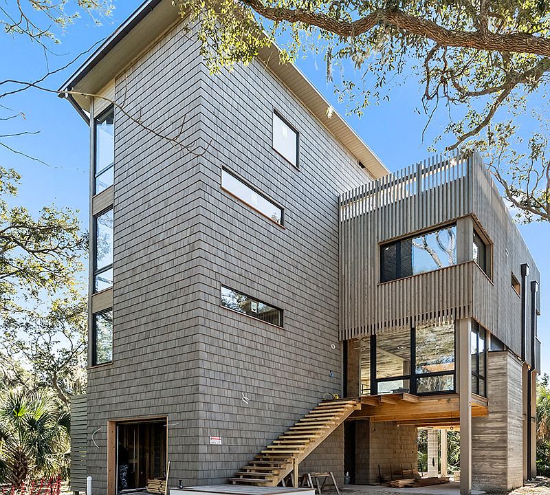 Outside, it’s clad in shingle siding, wooden slot siding cladding the bedroom wings , and modern, horizontal planking for the chimney wall. An open-riser staircase ascends to an open front porch fronted by a wall of framed glass. Inside, white oak hardwood and ceramic tile will stretch throughout.