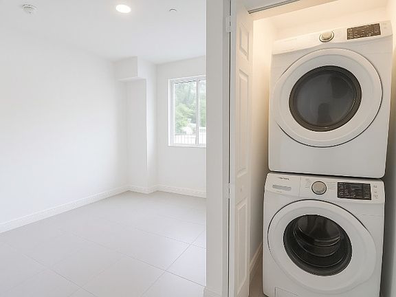 Additional guest bathroomQuartz countertopsIn-unit washer and dryerSleek tile floorsContemporary kitchenStainless steel appliances