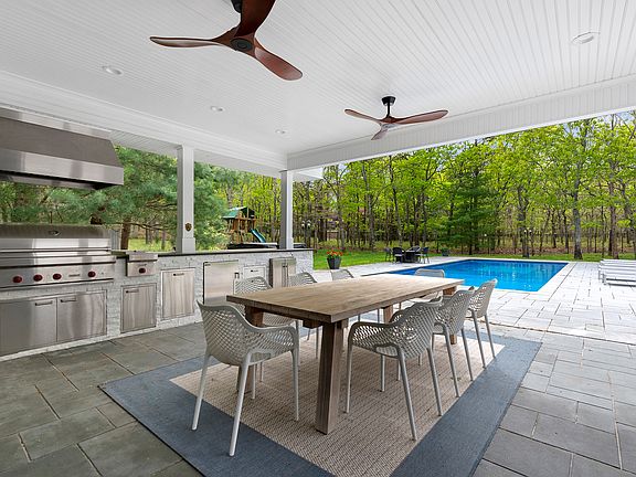 Rental Registration #: 24-1045 Rental Reg # 24-1045 Your Summer oasis awaits. Situated minutes away from both Sag harbor and East Hampton Villages and its beaches, this renovated 4 bedroom and 4 bathroom with Pool and basketball is ready to embrace all the fun that summer has to offer. The gourmet kitchen features Silverstone countertops, a new Viking stove and Bosch dishwasher, and overlooks the dining area large enough to seat family and guests as they enjoy one of the two gas fireplaces. There are two en-suite bedrooms with renovated bathrooms as well as two other bedrooms and a shared bathroom on the main floor. There is also a large living/family room with its own gas fireplace and patio doors that flow seamlessly to the outdoor space. It's all about the outdoor living as this home boasts an expansive resort style covered blue stone patio which features a commercial grade outdoor kitchen with a Wolf grill and side burner, Sub-Zero outdoor refrigerator, ice maker, granite countertops, wine fridge and a covered seating and bar area with LED lighting, a television and ceiling fans. Some of the other bonus features include the 20' x 40' heated pool with saltwater filtration system and outdoor shower, and a basketball court for the occasional one on one. The finished lower level offers bonus areas and additional family room with TV and full bathroom. Come see for yourself and make this home your summer paradise.
