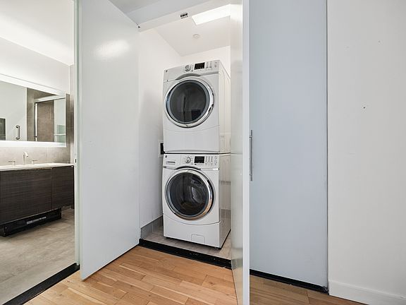 Building amenities include a part-time doorman, a sun-filled fitness center with floor-to-ceiling windows, and an on-site parking garage (available for an additional fee). Residents also enjoy a spacious rooftop terrace, perfect for lounging or soaking in skyline views.