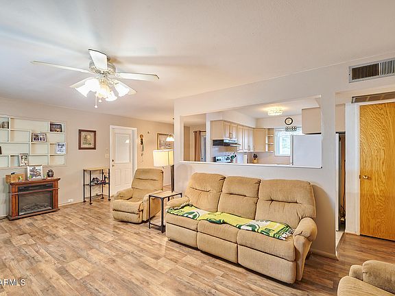 Move-in ready in Dreamland Villa (55+)! Bright living/dining with wood-look floors, updated baths, all-new windows, and a new septic. Spacious kitchen with built-ins. Comfortable main bedroom with private bath and large closet. Enjoy the AZ room and your own tangelo, grapefruit & orange trees, plus two storage sheds. North/south lot near University Dr., freeways, and shopping.
