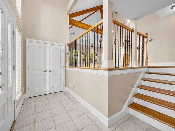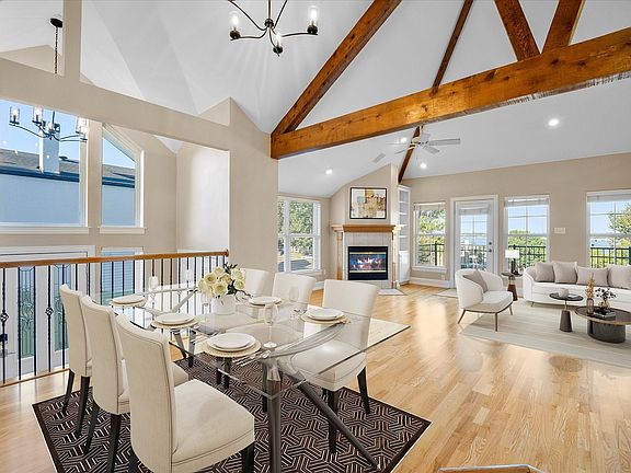 Bright open floor planWalls of windowsBeautiful beamed ceilingLush landscapingBreakfast bar