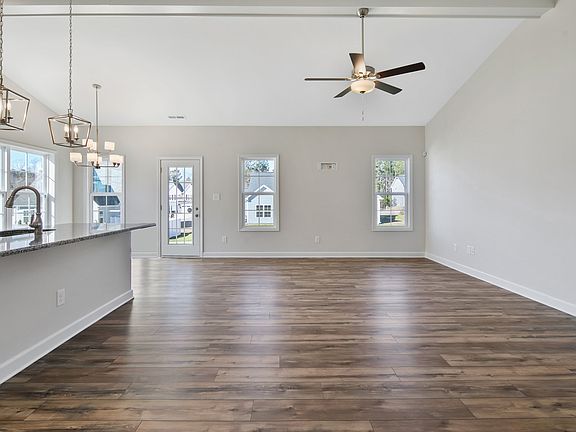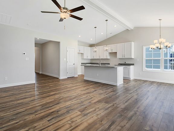 This home features an open-concept great room with a vaulted ceiling and faux wood beam detail. The kitchen is designed with an island and sink overlooking the great room, granite countertops in "New Caledonia," white shaker cabinets, and a pantry, complemented by stainless steel appliances including a microwave, dishwasher, and smooth top range. Adjacent to the kitchen, the dining area offers access to a rear-covered porch. The primary suite boasts a tray ceiling with crown molding and a primary bathroom with a dual vanity and quartz countertop in "Simply White," white shaker cabinets, a walk-in shower with a tile surround, a linen closet, tile flooring, and access to a spacious walk-in closet. There are two additional bedrooms on the first floor with hall access to a full bathroom featuring a vanity, tub/shower combination with tile surround, and luxury vinyl plank (LVP) flooring. The laundry room, located across from the garage entry, offers washer/dryer connections and LVP flooring, with a coat closet nearby. The second floor houses a fourth bedroom with a walk-in closet. Durable LVP floors are installed throughout the foyer, kitchen/dining area, great room, and laundry room. The exterior showcases low-maintenance vinyl siding with board and batten accents, a stone skirt, dormer, and black dimensional roof shingles. The front door, painted in Sherwin Williams "Iron Ore," includes a transom window and smart keypad access. A 2-car front-loading garage with a single-door ent Home Amenities include: CoveredPatio, GreenConstruction, WalkInClosets.