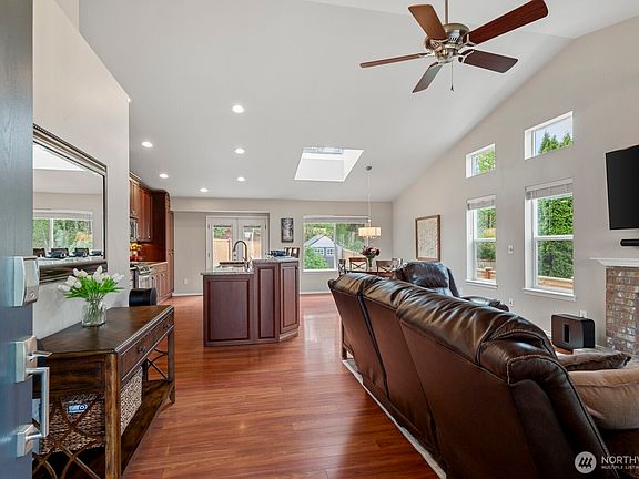 Welcome to Silver Firs! Fall in love with this one-level gem. Located on a quiet street and green belt lot. A covered porch greets you. This move-in ready home has been loving cared for and is ready for its next owner. Updates include fresh interior and exterior paint, presidential roof (approx 2021). New carpet throughout. Newer water heater. The open chef's kitchen offers ample work space and storage, granite counters and stainless appliances. Vaulted ceilings, skylights and an open floor plan provide an abundance of natural light. Cozy gas fireplace. 2 car garage. Entertain or relax in the fully fenced yard with patio. Quick access to shopping, freeways, transit, parks, and schools. Pre-inspected. This is the one!