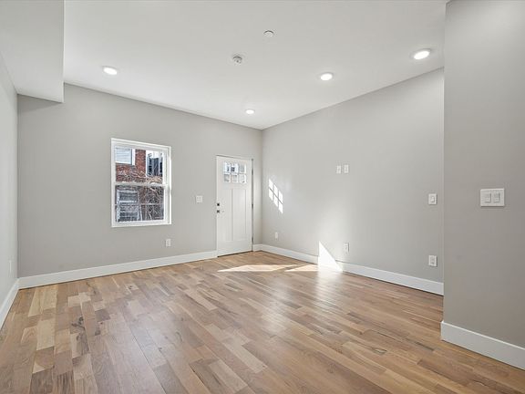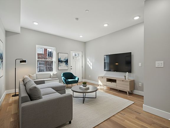 This contemporary apartment, located at 5414 Delancey St in Philadelphia, offers a thoughtfully designed living space across two floors. The 770 sq. ft. interior showcases a blend of modern aesthetics and functional design. The kitchen boasts stainless steel appliances, including a double oven and over-the-range microwave, complemented by white cabinetry and subway tile backsplash. Warm hardwood floors in the kitchen and living areas contrast beautifully with the striking geometric tile in the bathrooms. The bathrooms feature updated fixtures, including floating vanities and black hardware accents. Large windows throughout provide ample natural light, while recessed lighting adds a soft ambiance. The apartment's layout includes multiple rooms with ample closet space, as indicated by the double doors visible in one of the bedrooms. The neutral color palette of whites and light grays creates a bright, airy atmosphere, allowing for versatile decorating options. This well-appointed space combines style and comfort in a compact yet efficiently designed urban dwelling.