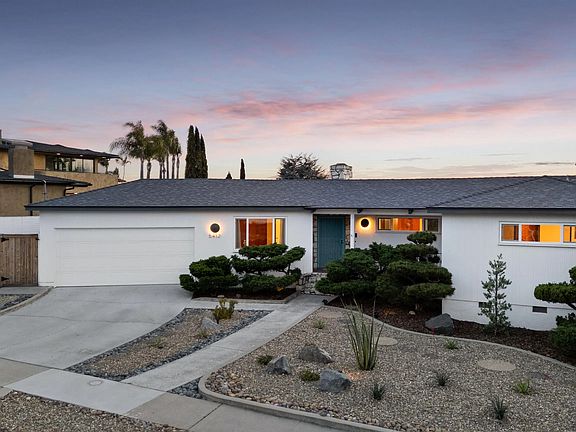 Welcome to this mid-century modern residence located in the highly sought-after College View Estates, situated on a canyon with incredible sunset views. This impeccably restored home maintains its original 1960s charm while incorporating modern upgrades for today's lifestyle. As you step inside, you are greeted by floor-to-ceiling windows that highlight the vaulted ceilings with iconic wood beams and wood-paneled walls. The home's warm ambiance is further enhanced by up-lighting, original light fixtures, hardwood flooring, and a showcase gas fireplace. The property features a new roof and is equipped with owned solar panels, dual-pane windows, an upgraded HVAC system, a water heater, and a completely remodeled kitchen with a built-in desk, indoor laundry room, and 2-car garage. Step outside to the expansive wrap-around covered patio and meticulous landscaping, where you can enjoy breathtaking western views over the canyon. Just minutes from the vibrant SDSU campus, parks, restaurants, and easy freeway access.