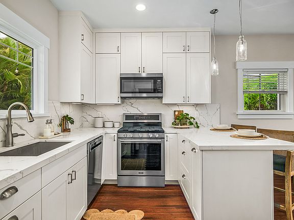 The existing residence is single-level and well-appointed, featuring hardwood flooring, solid quartz countertops, stainless steel appliances, vinyl-clad windows, and a Presidential roof. The recently repainted exterior in a clean, white coastal tone enhances curb appeal and blends beautifully with the tropical surroundings. With all infrastructure in place—including county water, sewer, and underground utilities—this is a move-in-ready property with inherent value and versatility.