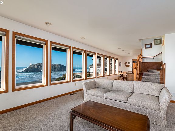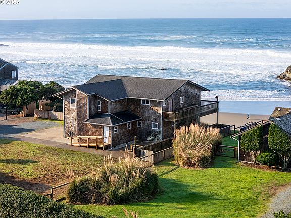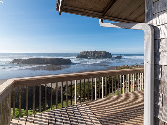 Wake up every day to waves and sand near your doorstep in this 4-bedroom, 3.5-bath oceanfront home in Bandon’s coveted Sunset City neighborhood. Nestled above the shoreline with its own private trail straight to the beach, this coastal retreat captures sweeping panoramic views of the Pacific from the main living areas and three bedrooms. Tall picture windows create an easy, relaxed flow that keeps the ocean in sight from morning coffee to evening sunsets. Inside, the great room and kitchen anchor the home, with view-filled living and dining areas oriented toward the water and a well-appointed kitchen ready for everyday living or entertaining. Four bedrooms, including an ocean view primary suite, offer comfortable separation of space for guests, multi-generational living, or a home office with inspiring vistas. With 3.5 baths, there is ample convenience for owners and visitors alike.An elevator provides easy convenience to all areas of the home, including direct access to the garage. Step outside to second-floor decking or ground level patios that frame unobstructed ocean and coastline views. The private beach trail invites daily walks on the sand, tidepool exploring, and front-row seats to Bandon’s famous sunsets and storm watching. Situated in the Sunset City neighborhood, this property offers a rare combination: direct beach access, dramatic vistas, and the tranquility of a tucked-away oceanfront enclave just a short drive from Old Town Bandon, world-class golf, and local dining.