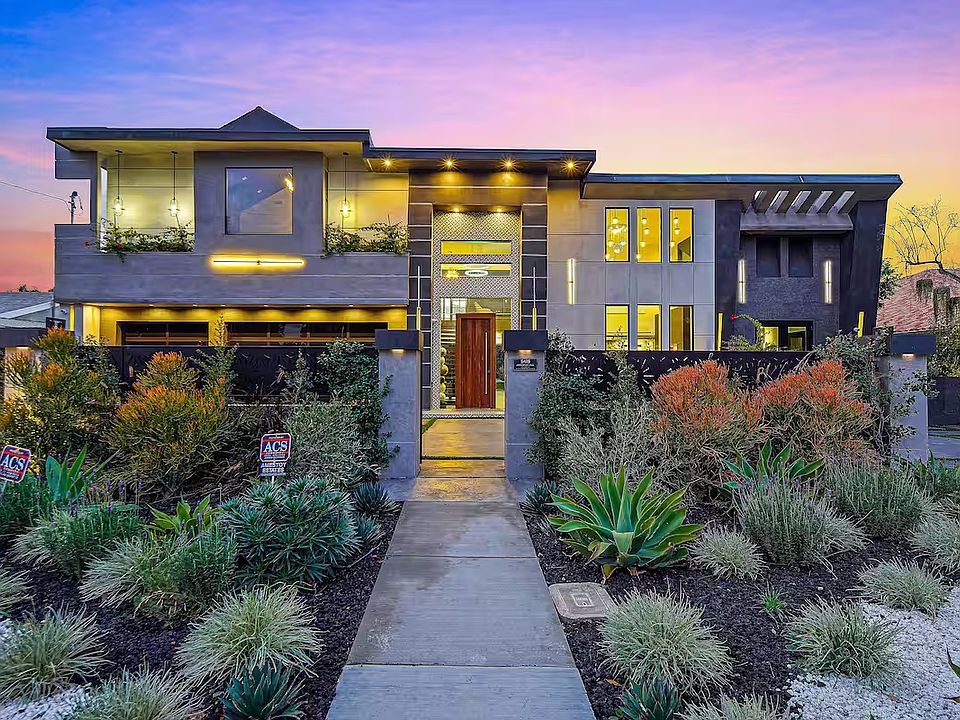 Enter through a dramatic glass-encased foyer and experience soaring ceilings and a palette of rich textures. Clerestory windows, custom lighting, and bold architectural features define the open-concept layout. A double waterfall kitchen island, Miele espresso bar, and seamless indoor-outdoor bar create the perfect space for entertaining.