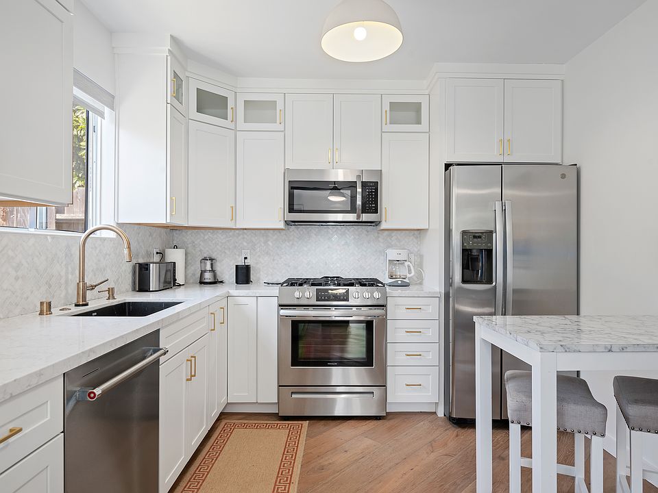 Step into a modern open-concept living room and kitchen featuring stainless steel appliances, quartz countertops, and a marble backsplash. The kitchen comes fully equipped with everything you need, and the living space includes a plush sofa and mid-century touches throughout. Hardwood flooring and curated artwork give this space an upscale yet relaxed coastal vibe.
