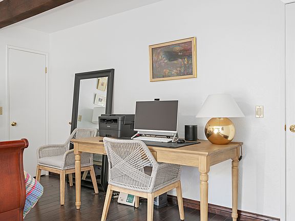 The oversized bedroom offers a peaceful sanctuary with a queen sleigh bed, exposed wood ceiling beams, a dedicated workspace, and direct access to the private patio. Two custom closet spaces with built in drawers, shelves, and hanging spaces make it ideal for extended stays.